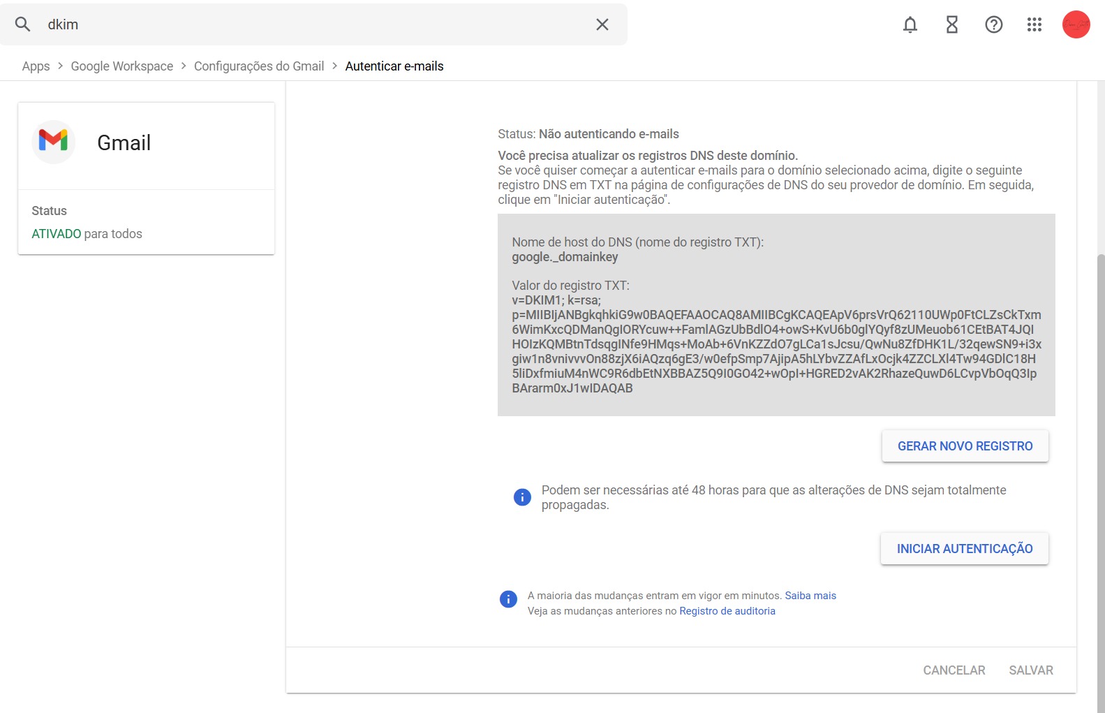 Sempre use os links do Google Admin Console para gerar novas chaves DKIM ou checar configurações.