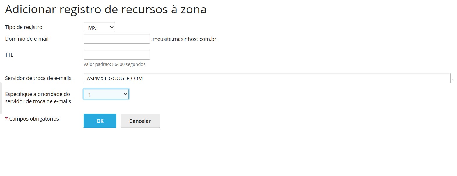 Prioridade Destino 1 ASPMX.L.GOOGLE.COM 5 ALT1.ASPMX.L.GOOGLE.COM 5 ALT2.ASPMX.L.GOOGLE.COM 10 ALT3.ASPMX.L.GOOGLE.COM 10 ALT4.ASPMX.L.GOOGLE.COM